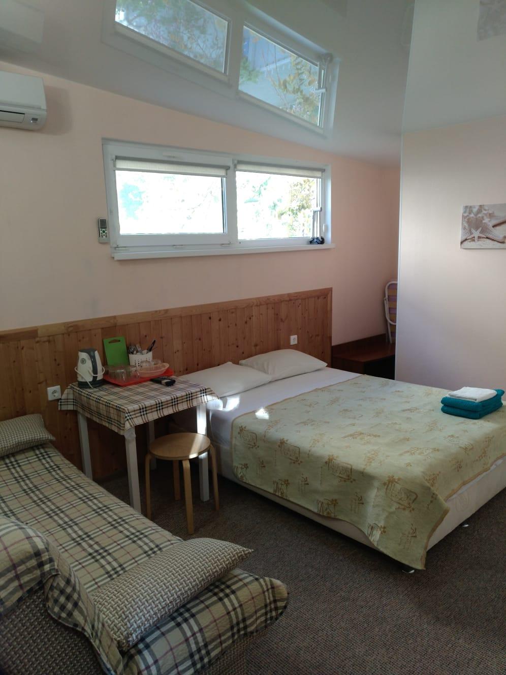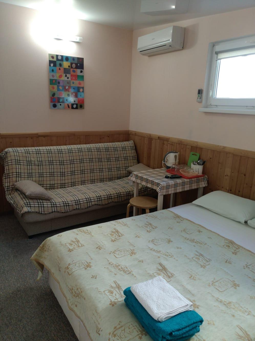 Размещение: двухэтажное здание. Каждый номер гостевого дома оснащен необходимым набором корпусной мебели, туалетной комнатой с санузлом и душем (холодная и горячая вода круглосуточно), телевизором, холодильником, кондиционером (сплит-система), электрочайником, микроволновой печью, набором посуды.